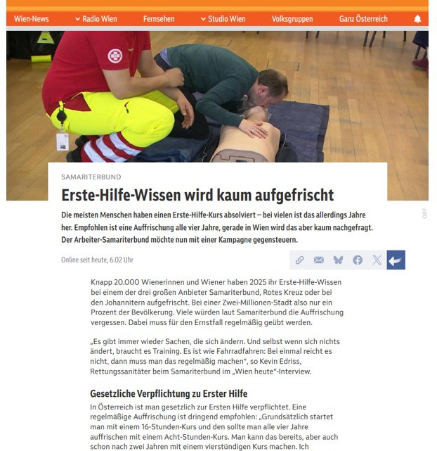 Knapp 20.000 Wienerinnen und Wiener haben 2025 ihr Erste-Hilfe-Wissen bei einem der drei großen Anbieter wie dem Samariterbund aufgefrischt. Bei einer Zwei-Millionen-Stadt also nur ein Prozent der Bevölkerung. Viele würden laut Samariterbund die Auffrischung vergessen. Dabei muss für den Ernstfall regelmäßig geübt werden.